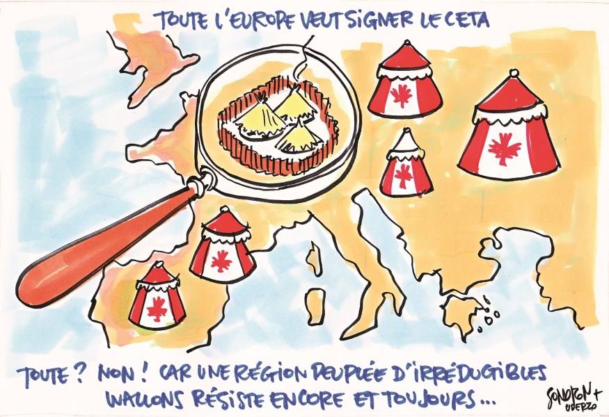 Αυτό το σκίτσο για την άρνηση της Βαλονίας να υπογράψει τη CETA, με έμπνευση από το γαλατικό χωριό του Αστερίξ δείχνει ανάγλυφα πως εξελίσσεται ένα σημαντικό θέμα που δεν βρίσκει απήχηση στα ελληνικά ΜΜΕ παρά την σημασία του. Και η κυβέρνηση ΣΥΡΙΖΑ που θα "άλλαζε την Ευρώπη" περιορίζεται -μέσω του κ.Σταθάκη- στα στενά εθνικά συμέφεροντα κατά τη διαπραγμάτευση της Συμφωνίας,